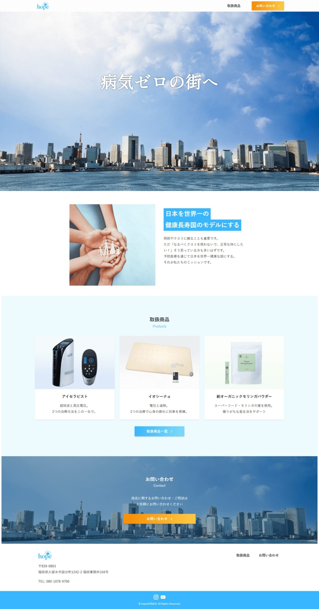 予防医療を軸とした健康商品を販売する、hope合同会社様のコーポレートサイトを制作させていただきました。